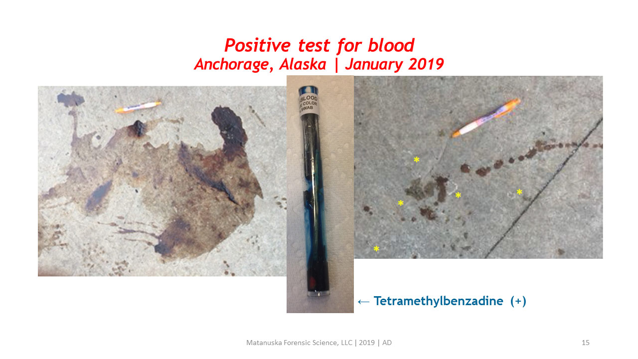 It was a dark and wintry night in Alaska…..is it blood? | Detection of dried bloodstains starts with using a presumptive chemical screening test followed by a confirmatory test. Importantly, presumptive tests are indicative of the presence of blood but are not wholly definitive. If basic physical conditions of the test are not met, the test result is invalid. Hint: Winter in Alaska!